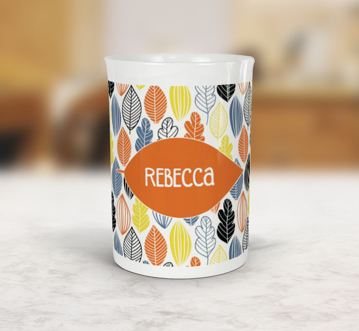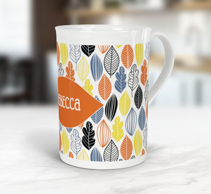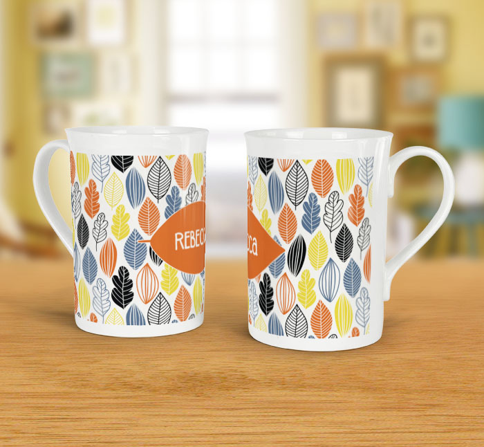 Choose from one of our pre-made mug designs where you can simply add a name to personalise making this personalised autumn leaves fine bone china mug a great gift idea.